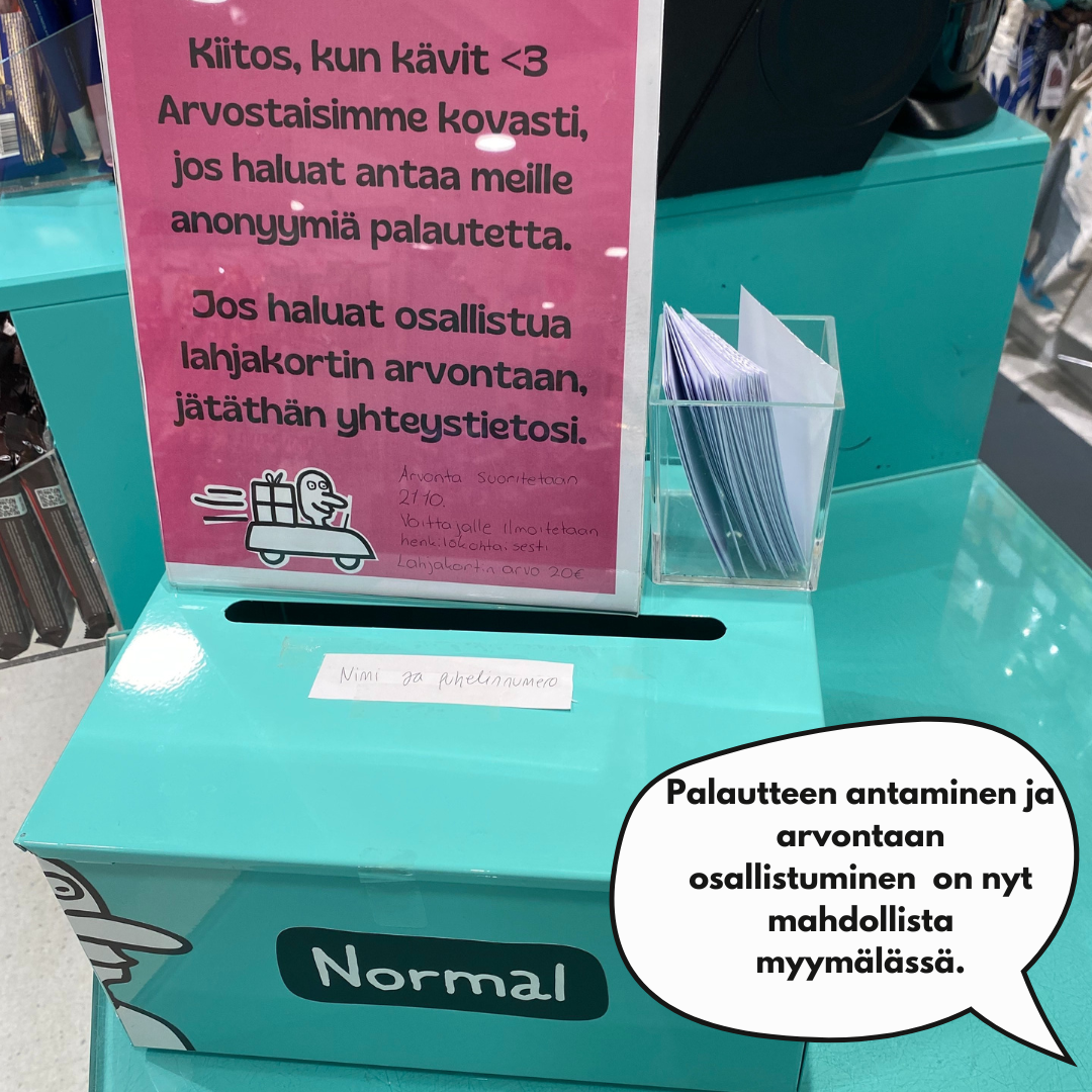 16.10.2024 Palaute/arvonta laatikko on koko tämän viikon myymälässä. Kaikki palaute on tervetullutta. Toiveita otetaan myös vastaan.